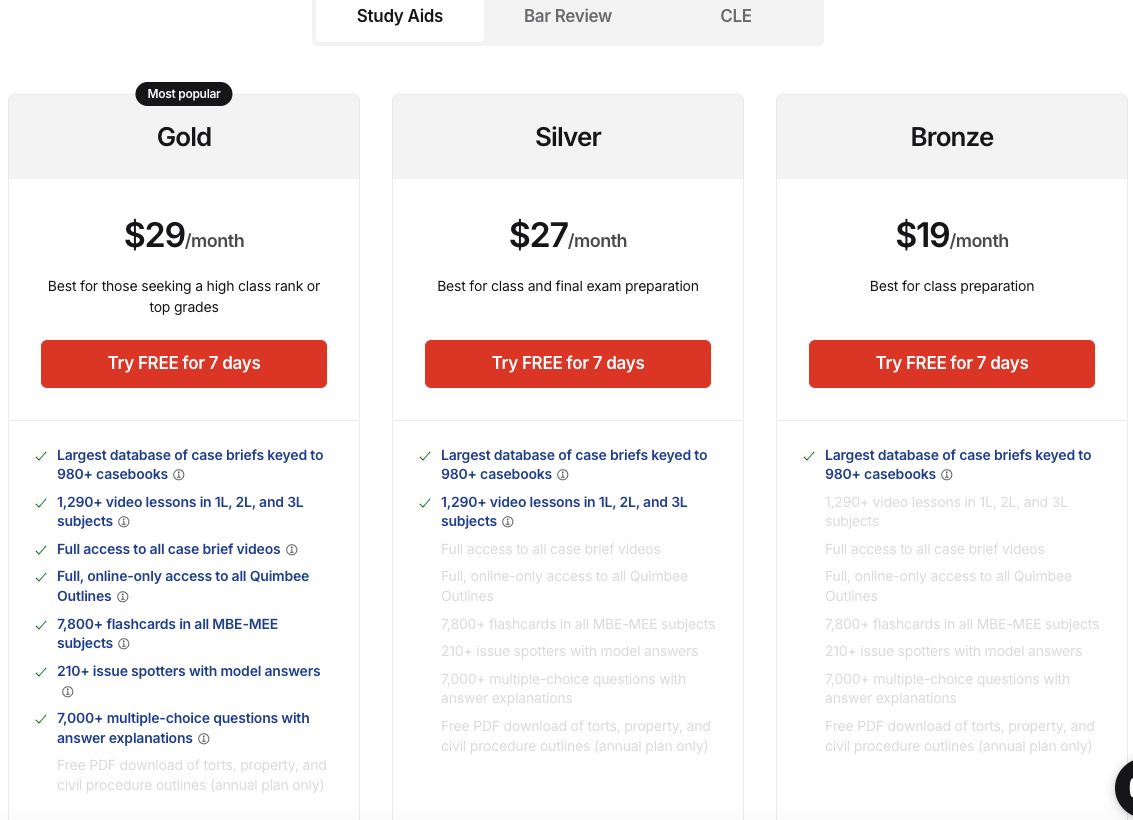 Quimbee doesn’t only cater to law students, but also legal professionals and bar examinees. I don’t know anything about the plans for the latter two, so I’m just focusing on law student plans, labeled “Study Aids” in the photo above.